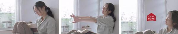 家の中のお気に入りの場所で本を読む忽那さん。気持ちが良く、うたたねをしてしまいます。画面は一度、クラージュの外張断熱の様子が映し出され、その後、一度目を覚ましますが、また眠りに入っていきます。