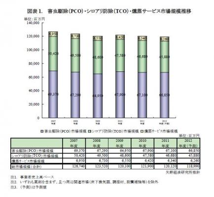 PCO(Pest Control Operator)サービスとはゴキブリ、ネズミ、ハエ、カ、ダニなどの公衆衛生害虫予防・防除・駆除をさし、TCO(Termites Control Operator)サービスとはシロアリ予防・防除・駆除をさす。また燻蒸サービスとは植物防疫法に基づく輸出入農産物燻蒸、および文化財燻蒸を対象とする。なお、いずれの市場にも薬剤を含まず、且つ周辺関連市場(床下換気扇、調湿材、耐震補強等)を除外している。
