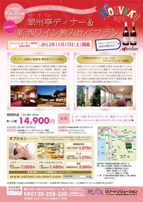 <会員イベント:女性限定10組20名様先着受付> 「翠州亭ディナー&新酒ワイン飲み比べプラン」 =今年のボージョレ・ヌーヴォーは優雅にリゾートで!~解禁後すぐ11/17(土)に開催!!