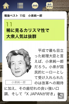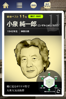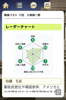 ・レーダーチャートによる実力分析で視覚的に各総理大臣の実力がわかるよう心がけました。