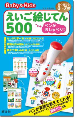 本書は、幼児英語学習の初期段階でぜひ覚えておきたい500の単語をイラストで紹介する絵辞典です。絵本を読むように楽しくページをめくりながら英語を学ぶことができます。単語(日本語および英語)、英会話フレーズ、歌・チャンツ(※)なども含めたすべての音声は付属の「音声ペン」に収録され、簡単な操作でネイティブの発音をくりかえし聞くことができます。「音声ペン」は、特殊な印刷をした本の誌面にタッチすると対応する音声が聞けるペン型の音声再生機器で、旺文社の書店商品では本書で初めて採用しました。0歳から小学校低学年まで長く使える内容なのでクリスマスシーズンやご出産、ご入園・ご入学祝いのプレゼントとしても最適です。