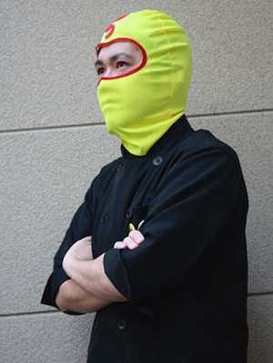 黄色のマスクをかぶってチキン南蛮カレーのPR活動をしています。