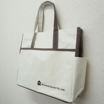 日本で初めての家事代行サービスを提供する企業が、お客様宅へお伺いする際に使用するスタッフバッグとして制作。機能的なデザインとココアブラウンの優しいカラーが、企業イメージと一致したため採用。お掃除代行やお料理代行のご依頼は同社HPより。