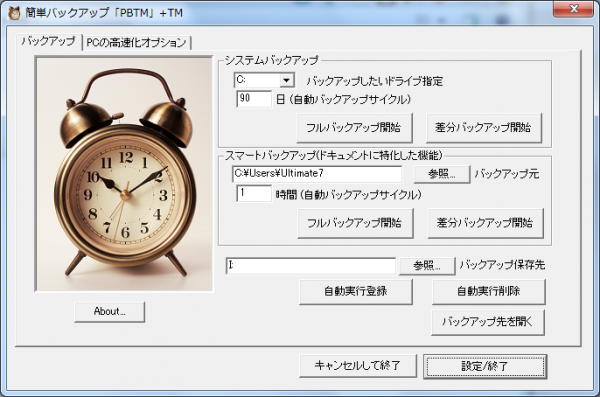 ドライブ全体のバックアップ、システムバックアップ、個別フォルダのバックアップに対応します。