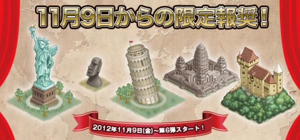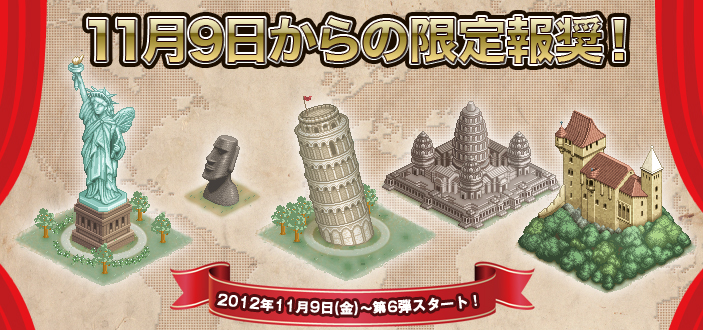 ゲーム画面『ミッション管理』にて『【期間限定】化石納品』を受注し、該当生産物を『達成チェック』にて納品後、入手 ■11/9からの限定報奨!第6弾は地主様待望のシンボルが多数!・イベント概要地主となってくださった皆様へ送る、期間限定の報奨第6弾です!!ドットイースト大陸において、様々な役割を持つ建築物達。その建築物達の効果を併せ持っているのが【特殊建築物】です。建てるだけで街を活性化させ、鮮やかに彩る美麗な様々な建物の設計図を期間限定でご用意いたします。