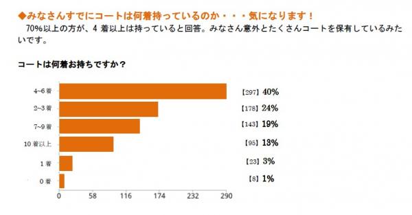 また、コートは何着お持ちですか?という質問には、70%以上の方が「4着以上」持っていると回答。たくさんコートを持っているにも関わらず、新たに購入したい方が多数いるという実情が判明しました。