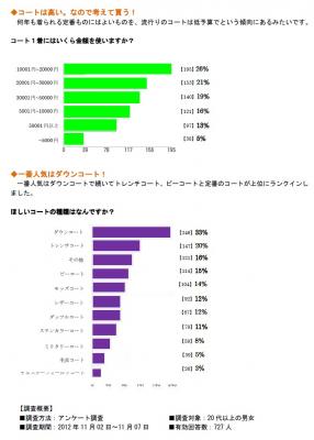 また、ほしいコートの種類は定番のコートが上位を占めるなか、ダウンコートが1歩リードといった結果となりました。回答のなかから、「長く着られる定番のコートはよいものを」、「流行のものは低予算で」という傾向がみられました。