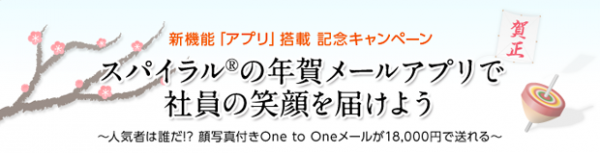 「スパイラル(R)」は、安心・安全に取引先やお客様に向けた担当者別の私信メールを送ることが可能です。新機能「アプリ」を活用し、年賀メールに最適な各種設定をパッケージ化した「スパイラル(R)」年賀メール2013アプリをご提供いたします。年賀HTMLテンプレートを選べる本キャペーンを期に、単なる配信ではない「スパイラル(R)」ならではの、顔写真付き私信年賀メールの訴求力を是非みなさまのビジネスにお役立てください。