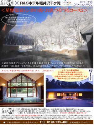 この企画は、お客様からご要望の多かった周辺温泉とコラボした宿泊のオプション企画で、昨年も大好評を博したプランです。とくに「R&Sホテル軽井沢千ヶ滝」から車で約10分と近い星野温泉“トンボの湯”は北原白秋や与謝野晶子もつかったといわれる名湯「美肌の湯」。弱アルカリのとろみのある泉質で、クレンジ作用と保湿作用という二つの美肌効果があります。通常は1,200円(他に+タオル代)の入浴料が必要ですが、今回の企画はR&Sホテルのお得な宿泊料金にプラス大人お一人様1,000円で、同温泉の入浴料+300円の貸しタオルセットが付いた特典付プランになっています。