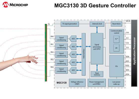 マイクロコントローラ、アナログ、Flash-IPソリューションのトッププロバイダであるマイクロチップ テクノロジー社(日本支社: 神奈川県横浜市港北区新横浜、代表: 渡辺敏弘 以下マイクロチップ社)は本日、幅広い種類の最終製品向けに直感的なジェスチャを利用した全く新しい非接触型のユーザ インターフェイスを実現する特許技術、GestIC(R)テクノロジを発表しました。MGC3130は世界で初めて電界ベースの3Dジェスチャ コントローラで、高速かつ高精度で安定した手先位置追跡と自由空間ジェスチャ認識の機能を低消費電力で実現しています。