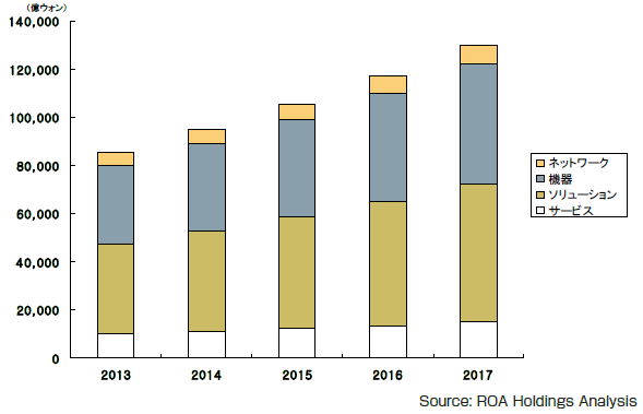 本報告書では、医療産業の変化を基盤に新しく台頭してきている韓国市場でのモバイルヘルスについて詳しく調査を行うと同時に、モバイルヘルスの範囲と定義について再規定を試みた。また、今後モバイルヘルスの本格導入が進む環境を仮定し、韓国国内のモバイルヘルス市場を「サービス」「ネットワーク」「機器」「ソリューション」の4カテゴリーに区分し市場規模を予測している。2013年以降、韓国モバイルヘルス関連市場はCAGR(2013年~2017年)=11.1%水準で成長すると予想され、2017年には13兆ウォン規模まで市場が拡大すると推定している。