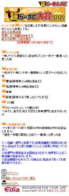 投票は、総合部門の「らーナビ大賞」をはじめ、2011年11月~2012年10月に新しくオープンした店舗を対象とし投票を行う「12年度新店大賞」や、醤油・塩・味噌・豚骨・つけ麺・オリジナルなど、ラーメンの味別で投票を行う「味別大賞」の計3部門。