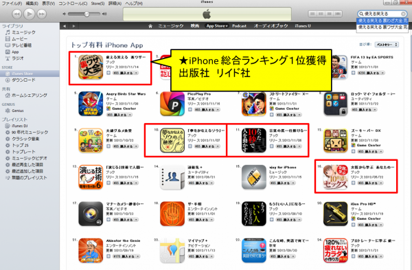 iPhone電子書籍ランキング1位を獲得したアプリが45書籍以上あり
