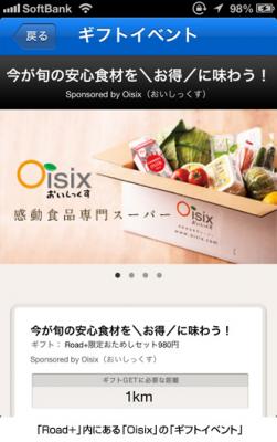 連携にともない、リンクシェア・ジャパンの大手広告主である「Oisix(おいしっくす)」の掲載が開始し、「野菜がたっぷり食べられるRoad+限定お試しセット980円(送料込み)」がギフトとして提供されました。「Road+」の利用者は、本アプリ内にある「Oisix」の「ギフトイベント」に参加登録をして、1kmを歩行すると、ギフトを取得することができます。