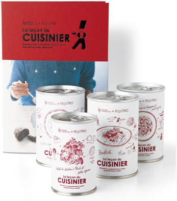 本格的なフランス料理の前菜、スープ、メインディッシュ2種の計4種類を2人分ずつ詰め込んだ缶。山口シェフが1年半かけて開発したオリジナルの24メニューを4種類ずつ、6カ月間お届け。