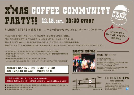 株式会社ベイクルーズグループ(東京都渋谷区、代表:窪田 祐)は、「COFFEE GEEK FRIENDLY」をテーマとしたコーヒーショップ・ブランド 「FILBERT STEPS | (http://filbert-steps.jp/)」にて、2012年12月15日(土)19:30~21:30に【X'mas Coffee Community Party!!】を開催。