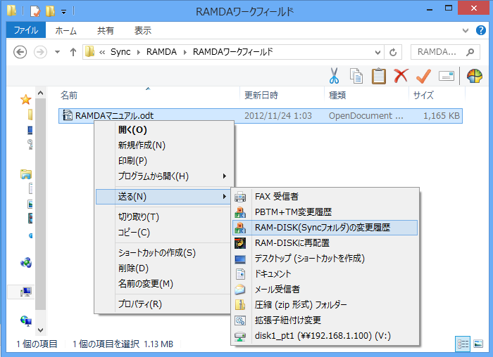 RAM-DISKに再配置したいフォルダを選択しマウス右ボタンを押すだけで[RAM-DISK]に転送、自動再配置する機能を装備します。希望するフォルダをRAM-DISKにワンタッチに配置します。