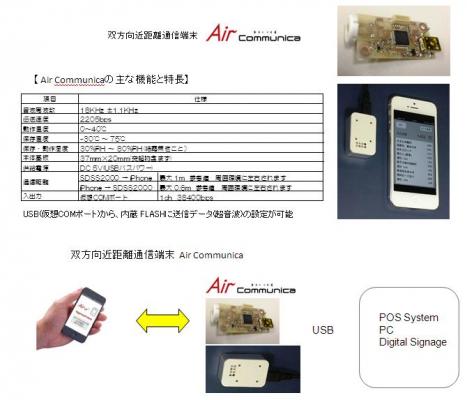 デジタルからアナログまで幅広く、コミュニケーション活動の制作を行なってる株式会社アルファポイント(本社:名古屋市)は、システムデザイン(福井市)との業務提携により、既に2012.9月に発売開始したフェリカリーダーライタにAir(音響コード発信)を搭載したSiteStamperAir、音響コード専用発信端末Air/LT(長距離版) Airシリーズに加えて、双方向近距離通信端末 AirCommunicaを販売いたします。