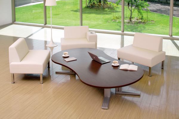 ユニークなひょうたん型の天板形状が場を和らげ、自由なポジションにチェアを配置することで個人のリラックス環境が生まれます。