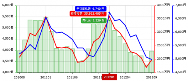 赤の折れ線:総落札額、青の折れ線:平均落札額、緑の棒グラフ:落札数