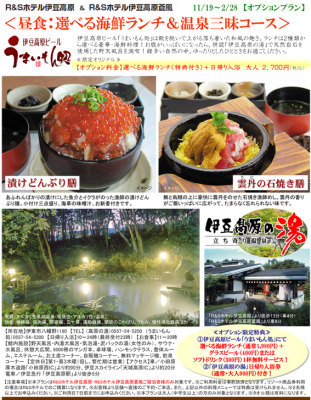その一環として、リソルが伊豆高原で運営するR&Sホテル2施設=「R&Sホテル伊豆高原」と「R&Sホテル伊豆高原蒼風」では現在、伊豆急行線「伊豆高原駅」より徒歩5分の『伊豆高原ビール うまいもん処』とタイアップして“選べる海鮮ランチ&温泉三昧コース”のオプションプラン(下記参照)を企画、2013年2月28日までの予定で開催中です。