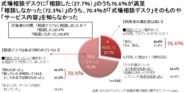 ━式場相談デスクに「相談した(27.7%)」のうち76.6%が満足、「相談しなかった(72.3%)」のうち、70.4%が「式場相談デスク」そのものや「サービス内容」を知らなかった