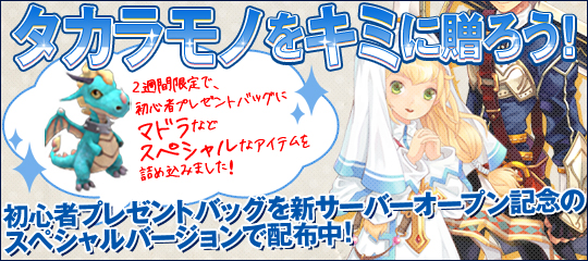 新サーバオープンから2週間限定で、初心者プレゼントバッグに旅のお供として、とても強力なフェアリア【マドラ】など、スペシャルなアイテムを大量に詰め込んだ【初心者プレゼントバッグ】を配布いたします。この機会に是非、新サーバーでプレイしてみてください。