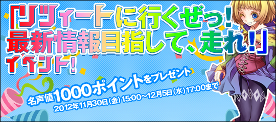 イベント期間中に、指定のツイートをリツイートして、「報告フォーム」にしたがって「お問い合わせ」までご報告いただいた方全員に、リゾン戦記の冒険を進める為にお役にたてる【名声値1000ポイント】をプレゼントいたします。