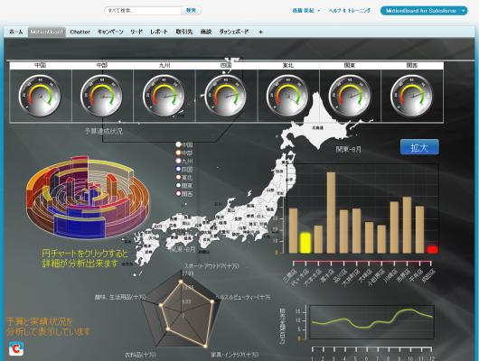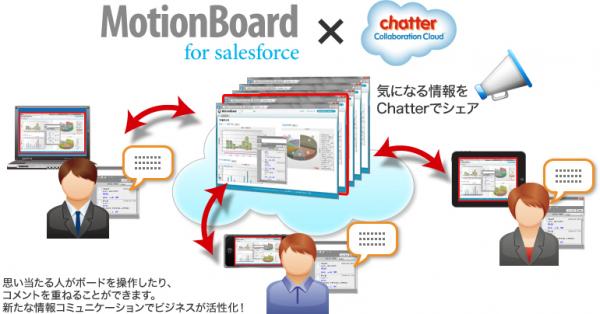 「MotionBoard for Salesforce」は、「Salesforce CRM」や「Force.com」上に展開される様々なアプリケーション・データを簡単な操作で分析対象データとして取得できるだけでなく、企業内データなども参照可能となり、ユーザーはSalesforceの画面上で1つのタブとして存在する「MotionBoard for Salesforce」の利用により、様々なデータの集計・分析・可視化が可能となります。また、セールスフォース社が提供する企業内SNSである「Chatter」ともシームレスに連携しており、「MotionBoard for Salesforce」で導きだした結果をChatter経由でリアルタイムにSalesforce利用者に通知・共有することで、迅速な情報共有や意思決定・経営判断を促し、変化をチャンスと捉える多くの企業のビジネススピードに貢献いたします。