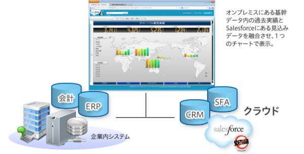 クラウドにあるSalesforceと、ERPなどオンプレミスに存在するデータを統合いたします。実績データと見込みデータなど自在に組み合わせ、標準のSalesforceでは出来ないダッシュボードを作成できます。