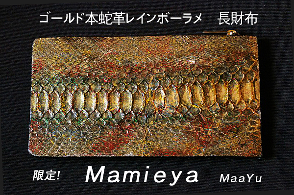 新染色ゴールド本蛇革レインボーラメ縦開き長財布