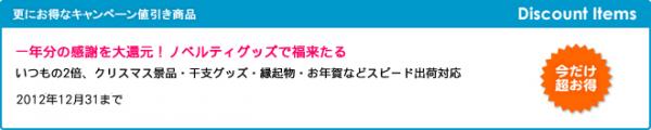 本年も残すところあと1ヶ月。販促ノベルティ卸売りセンターでは、今年最後の値引きキャンペーンを通常の2倍の特大規模で開催いたします。お得なこの機会に、名入れノベルティを是非ご検討ください。皆様のご利用をお待ちしています。2012年12月31日まで。