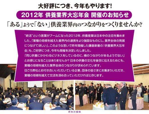 特に、2012年は“終活”ブームも相まって、「自分の将来を自分で考え、事前に行動する」という人々が急増しています。日ごろ、「横のつながりが無い」「新しいことをしようにもなかなか他の業種との連携が取れない」「供養や高齢者を支えるビジネスに関心がある」といった方々にお集まりいただき、最新の情報を交換し合い、さらには、ここで得た情報が、それぞれの企業にとって新たなビジネスチャンスにつながることを願っています。