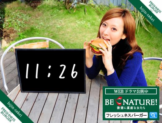 またタイアップ期間中、全国版美人時計(11時台、14時台)からの誘導先として、フレッシュネスバーガー オリジナルWEBドラマ【BE NATURE! ~欲望に素直な女たち~】をご紹介します。