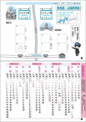 ドリルは、新幹線の路線ごとに7つのチャプターから構成されており、新幹線の駅の順番に沿って漢字を書き込めるようになっています。各ページには、駅名だけでなくその駅がある県の名前や県庁所在地も掲載しています。また、新幹線路線図の台紙も付いていますので、どのあたりの駅名を書いているのか台紙を見ながら楽しく学習することもできます。
