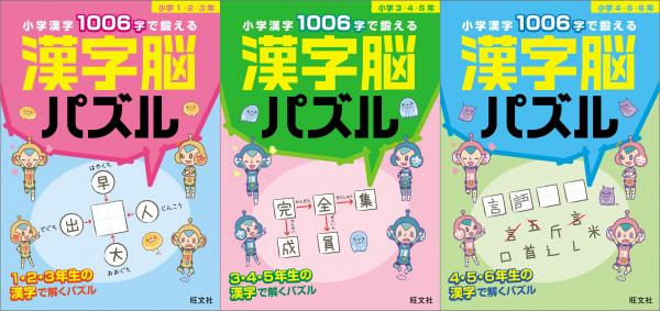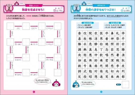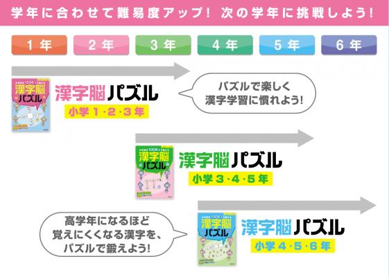 漢字脳パズルでは、バラバラにした漢字を組み立てて漢字に直したり、共通の部首を探して漢字を組み立てたりします。そのため、漢字がどんな部分から成り立っているか、どの形がどのような意味を持っているか、など漢字そのものの仕組みがわかるようになっています。また、二字熟語をつなげたしりとりでは、同じ漢字を使った熟語によって、その漢字の持つ意味がわかります。ドリル内には各対象学年で習う漢字のほとんどが掲載されています。学年別になっているので、習った漢字だけで取り組むことができます。