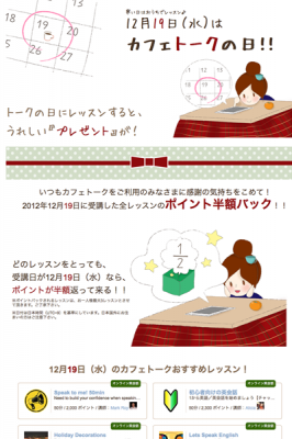 ※日本時間の2012年12月19日0時~23時59分までに開始のレッスンに限られます。