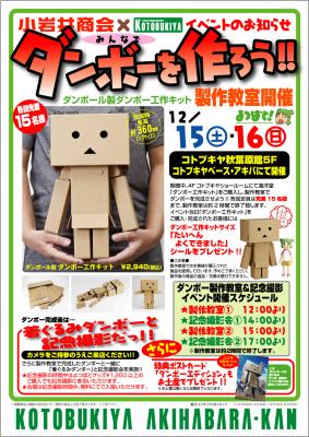 12月15日(土)、16日(日)にコトブキヤ秋葉原館4階ショールームにて海洋堂「ダンボー工作キット」をご購入いただいたお客様対象に製作教室を開催。各回定員15名までとなっており、製作教室は約2時間で終了。製作教室の後は「着ぐるみダンボー」との撮影会を実施致します。Wダンボーと撮影のチャンスです!