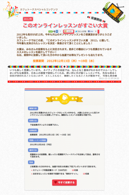 そこで、この度カフェトークでは、2012年度に受講されたレッスンを対象に投票を行い、選考の上、2012年度に最も支持されたオンラインレッスンを発表させて頂くことにしました。
