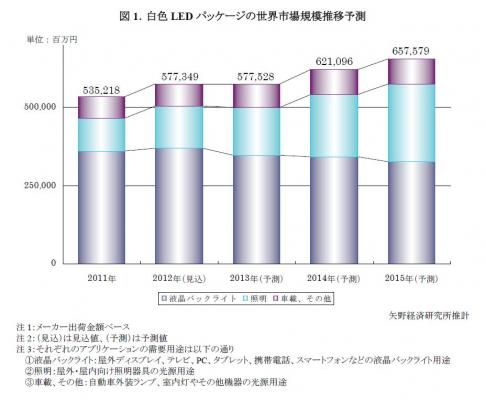 本調査における白色LEDパッケージ市場では、需要用途(アプリケーション)によっては事業が垂直統合され、製品として出荷されるために、白色LEDパッケージとして市場投入されない場合は、これをパッケージ市場価に換算して、市場規模を算出した。