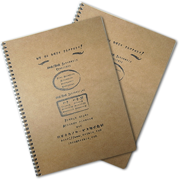 理化学機器製造などを事業とする企業が、名古屋の大学で開催された国際シンポジウムに出展した際、企業PRとして来場者に配布したノベルティ。講演会場で直ぐに利用できることからノートを選定、英語表記の同社の主力製品を名入れ印刷されたとのこと。