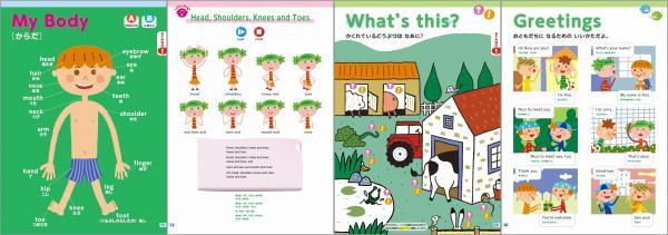 絵じてんだけでなく英語の音とリズムが身につく歌・チャンツ(5曲)、何度もくりかえし取り組めるクイズ(2種類)、基本的なあいさつや会話のコーナー(3場面)もあるので、親子で一緒に楽しみながら英語に親しめます。