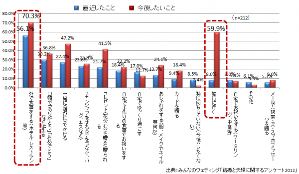 【結婚記念日:直近も今後も、人気は「外での食事」「旅行に行く」が今後では人気の傾向】
