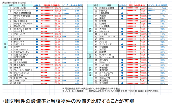 また対象物件の周辺物件の詳細情報とも簡単に比較検討できます。例えば、「ペット可」や「浴室乾燥機つき」などのこだわり条件の有無や、周辺物件の設備率などは分かりやすくグラフで可視化し、オーナー様にも一目瞭然で比較検討してもらうことができますので、管理会社様は内装やリノベーション、リフォームのご提案の補助材料としてお使いになることができます。