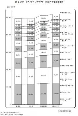 本調査におけるスポーツアパレル市場とは、トレーニングウエア、ゴルフウエア、アウトドアウエア、ライフスタイルウエア、サッカー・フットサルウエア、野球・ソフトボールウエア、テニスウエア、スイムウエア、スキー・スノーボードウエア、フィットネスウエア、陸上競技・ランニングウエア、バスケットボールウエア、バレーボールウエア、その他ウエアの14分野を指す。その他ウエアには、柔道着・空手着・ラグビーウエア・マリンスーツ・卓球ウエア等が含まれる。