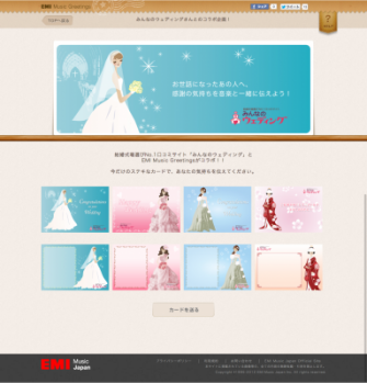 結婚式場選びNo.1口コミサイト「みんなのウェディング」※( http://www.mwed.jp/)を運営する株式会社みんなのウェディング(本社:東京都中央区、代表取締役:飯尾慶介)は、株式会社 EMIミュージック・ジャパン(本社:東京都港区、代表取締役会長:行方均)が展開する、試聴楽曲付きグリーティングカード『EMI Music Greetings( http://tegaki.emimusic.jp/ )』と連携し、様々なスタイルの花嫁がデザインされた、みんなのウェディングオリジナルカードを、2012年12月20 日より提供いたします。