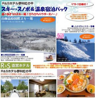このプランは、さらさらパウダースノーの蓼科高原のスキー場2つからどちらか滑りたいゲレンデのリフト1日券が選べるという企画で、選べるスキー場のひとつはスキーヤーオンリーのゲレンデ「白樺高原国際スキー場」(長野県北佐久郡立科町蓼科牧場、ホテルから車で約33分)、もうひとつはスキー&スノボが楽しめる「しらかば2in1スキー場」(立科町八子ヶ峰、ホテルから車で約22分)。
