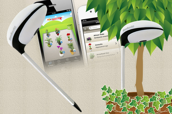 つまり、鉢植えや庭の土に Koubachi (コウバチ)を差し込み、無線LAN経由でインターネットと接続しておくだけで、パソコン、iPhone、iPadなどで、外出先でリアルタイムに観葉植物の生育環境を確認することができます。