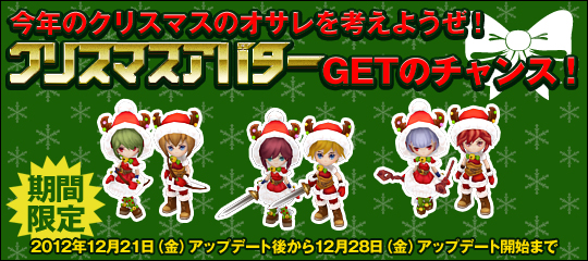 12月21日(金)のアップデート後にクリスマス期間限定の特別のダンジョン「聖なる大地」が追加されます。このダンジョンのモンスターから得られる「鈴」を一定量入手する事で、クリスマス限定アバターと交換できます。またダンジョンで集めるのはちょっと・・・という会員様には、ショップで販売を行っていますので、そちらをご利用ください。期間限定ですので、この機会にお見逃しなく。