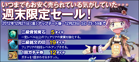 週末限定セール「いつまでもお安く売られている気がしていた・・・週末限定セール!」キャンペーンを開催します。新しいフェアリアの登場に伴い、フェアリアを強化するのにとても便利アイテムと、クリスマス限定フェアリアを手に入れてもらいたいという願いも込めガチャ券を、クリスマスセール価格で販売いたします。クリスマス限定フェアリア達と聖なる夜を過ごしてください。